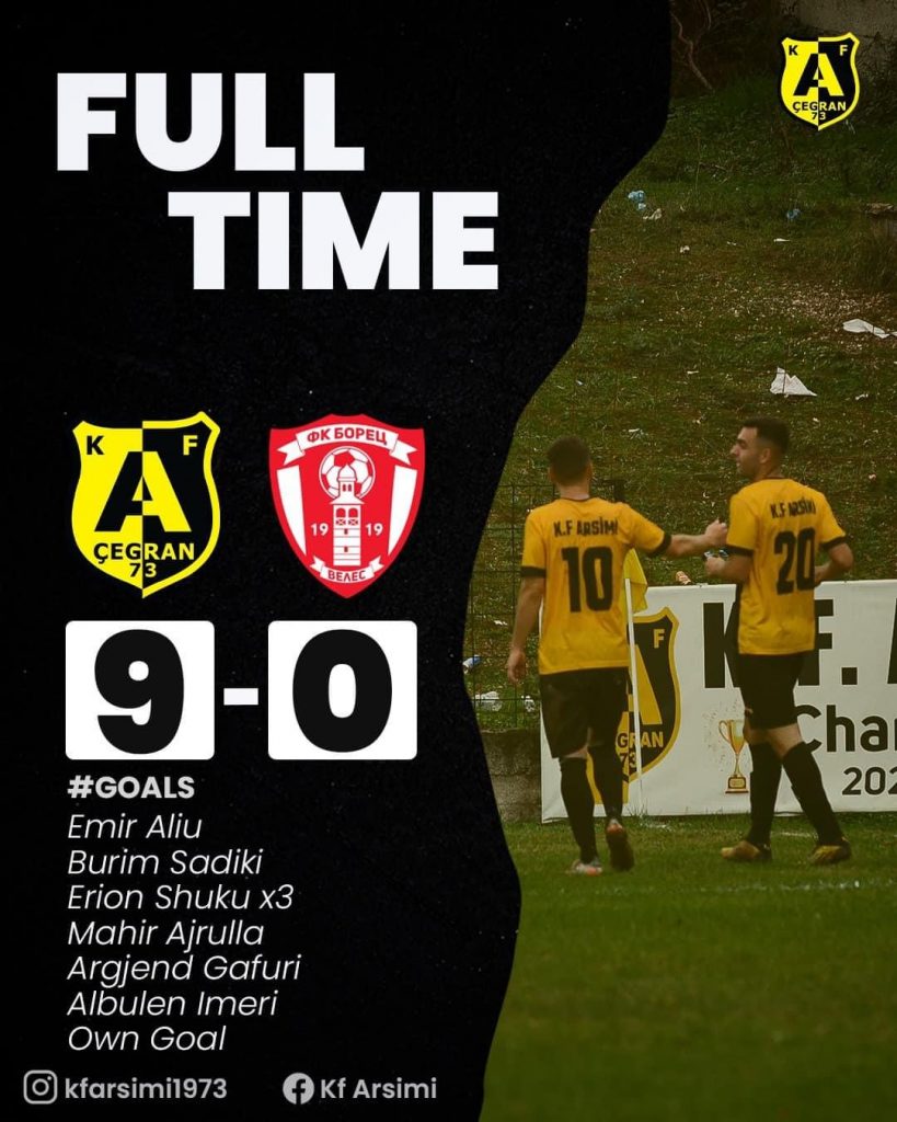 Fitore rekorde për Arsimin e Çegranit në Ligën e Dytë të futbollit në Maqedoninë e Veriut. Plotë 9 gola kanë realizuar futbollistët e Çegranit sot në duelin e xhiros së 6-të përballë Borecit të Velesit.