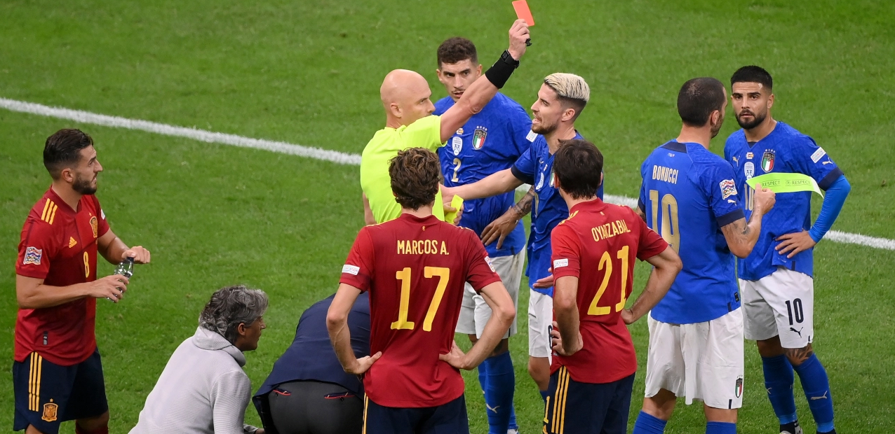 Figura më tragjike te ‘Azzurët’ në këtë ndeshje ishte Leonardo Bonucci që u ndëshkua me karton të kuq në min e 42’ pasi goditi me bërryl Sergio Busquetsin.