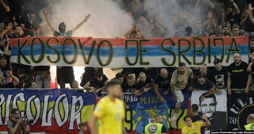 Tifozët e kombëtares rumune të futbollit, mes të cilëve edhe anëtarë të organizatës Kamarazi, gjatë ndeshjes kanë shpalosur një pankartë ku shkruan “Kosova është Serbi” dhe për këtë arsye loja u ndërpre.