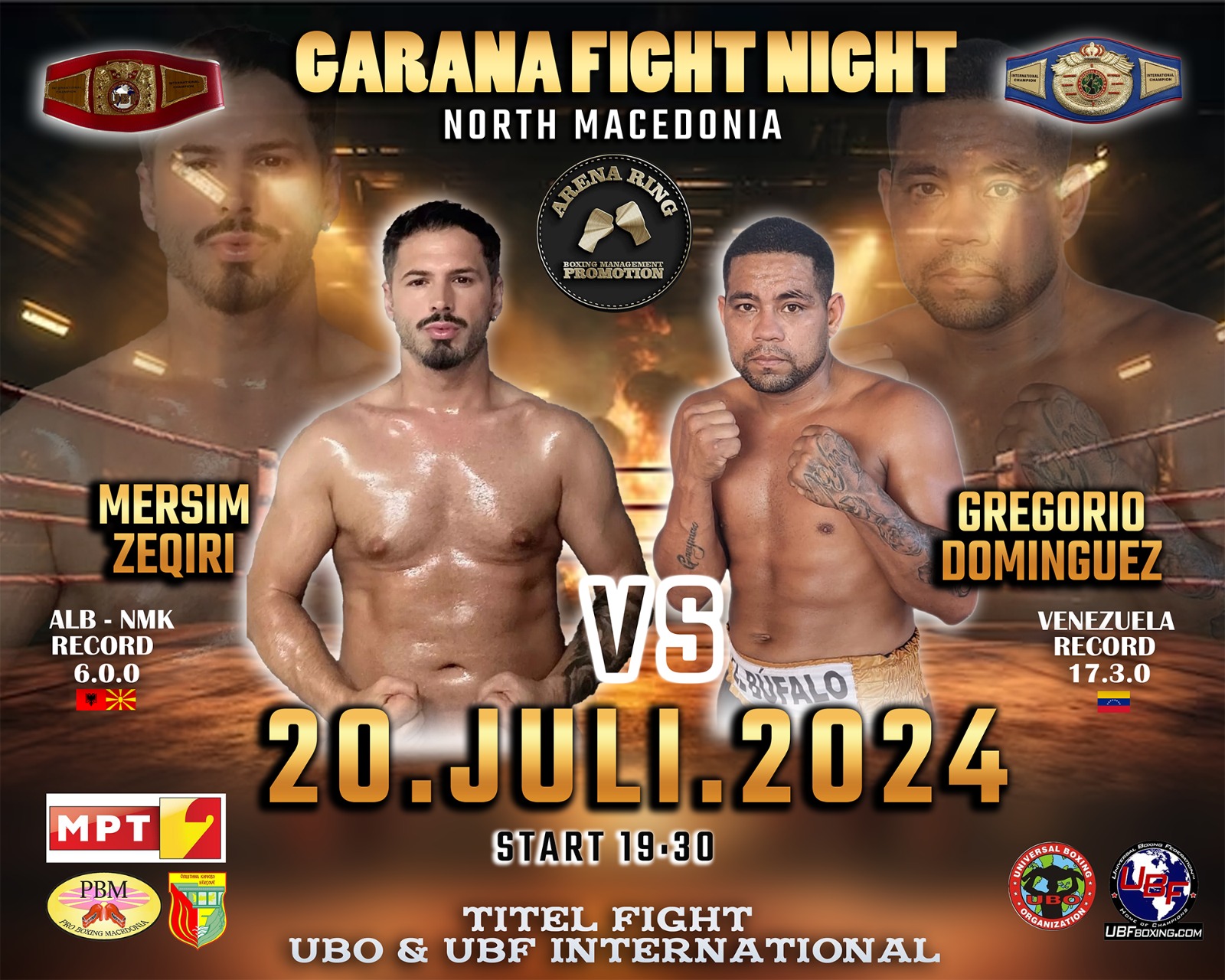 Tani më është bërë gjithçka zyrtare, Gregorio Dominguez nga Venezuela do të jetë kundërshtar i boksierit shqiptar, Mersim Zeqiri i cili do të luftoj për dy titujt internacional UBO e UBF, ndeshje kjo e cila do të zhvillohet me 20 korrik 2024 në Garana të Maqedonisë së veriut e që e njëjta është nën organizim të promotorit Avdyl Salihu.