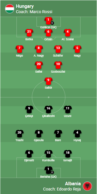 Hungari: Gulasci; Botka, Orban, Szalai; Nego, A.Nagy, Schafer, Nagy; Sallai, Szoboszlai; Salloi