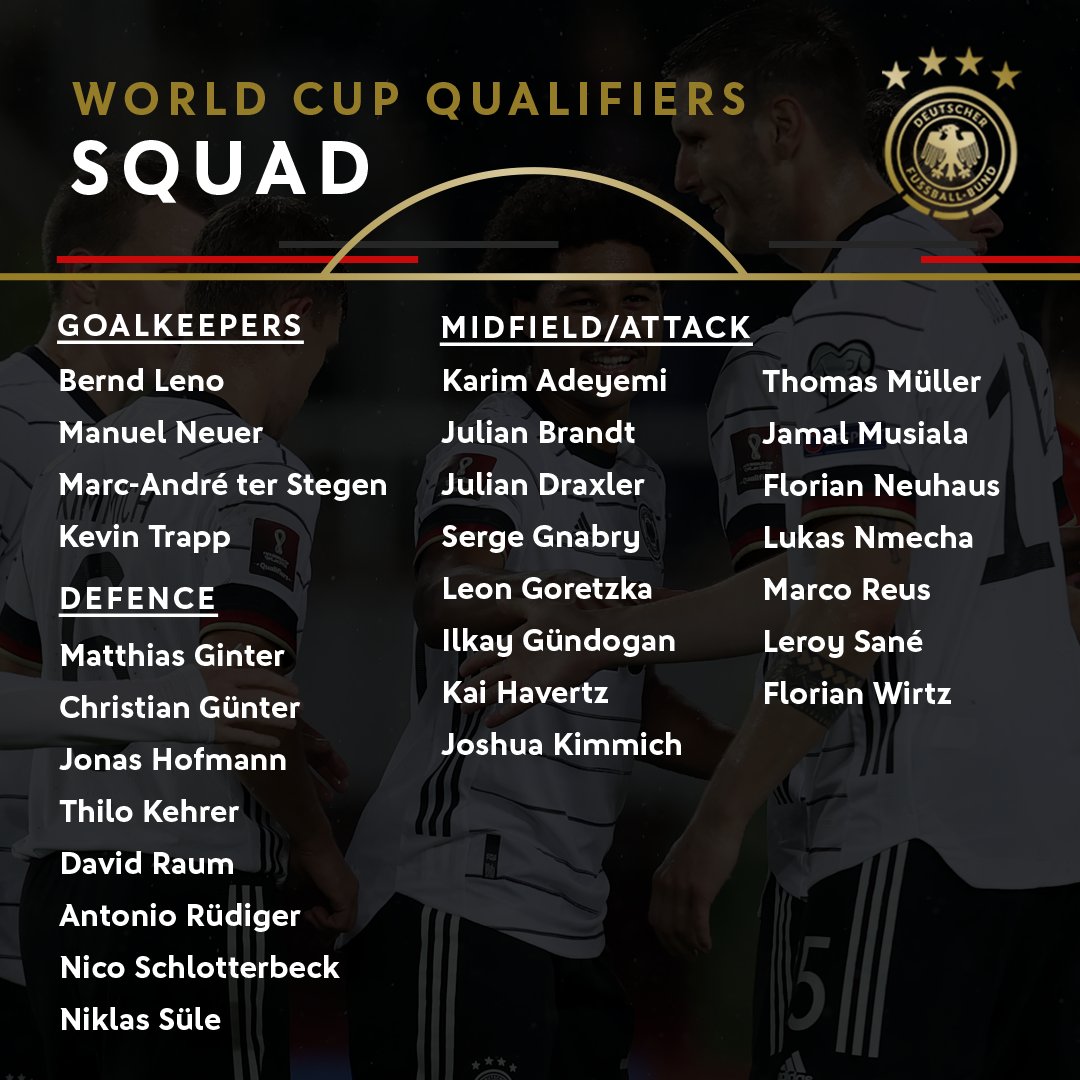 Në listë janë ftuar edhe disa futbollistë të rinj, duke marrë parasysh faktin që Gjermania tashmë është kualifikuar dhe trajneri do t’i jap hapësirë futbollistëve që kanë luajtur më pak.
