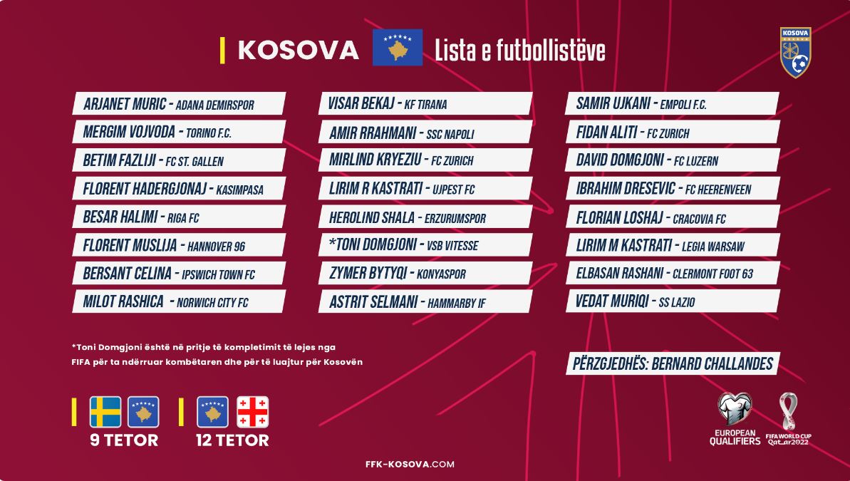 Pjesë e listës është edhe futbollisti i Vitesses, Toni Domgjoni, por i cili ende është në pritje për të marrë lejen nga FIFA për t’u paraqitur në fanellën e Kosovës.