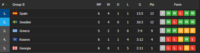 Kosova renditët në pozitën e parafundit me katër pikë, tetë më pak se Suedia që mban të dytën, derisa janë edhe dy ndeshje pa zhvilluar.