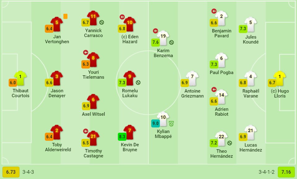 Golat për belgët u shënuan nga Carrasco (37′) dhe Lukaku (41′), gjersa për francezët u realizuan nga Benzema (62′), Mbappe (69′) dhe Theo Hernandes (90+1).