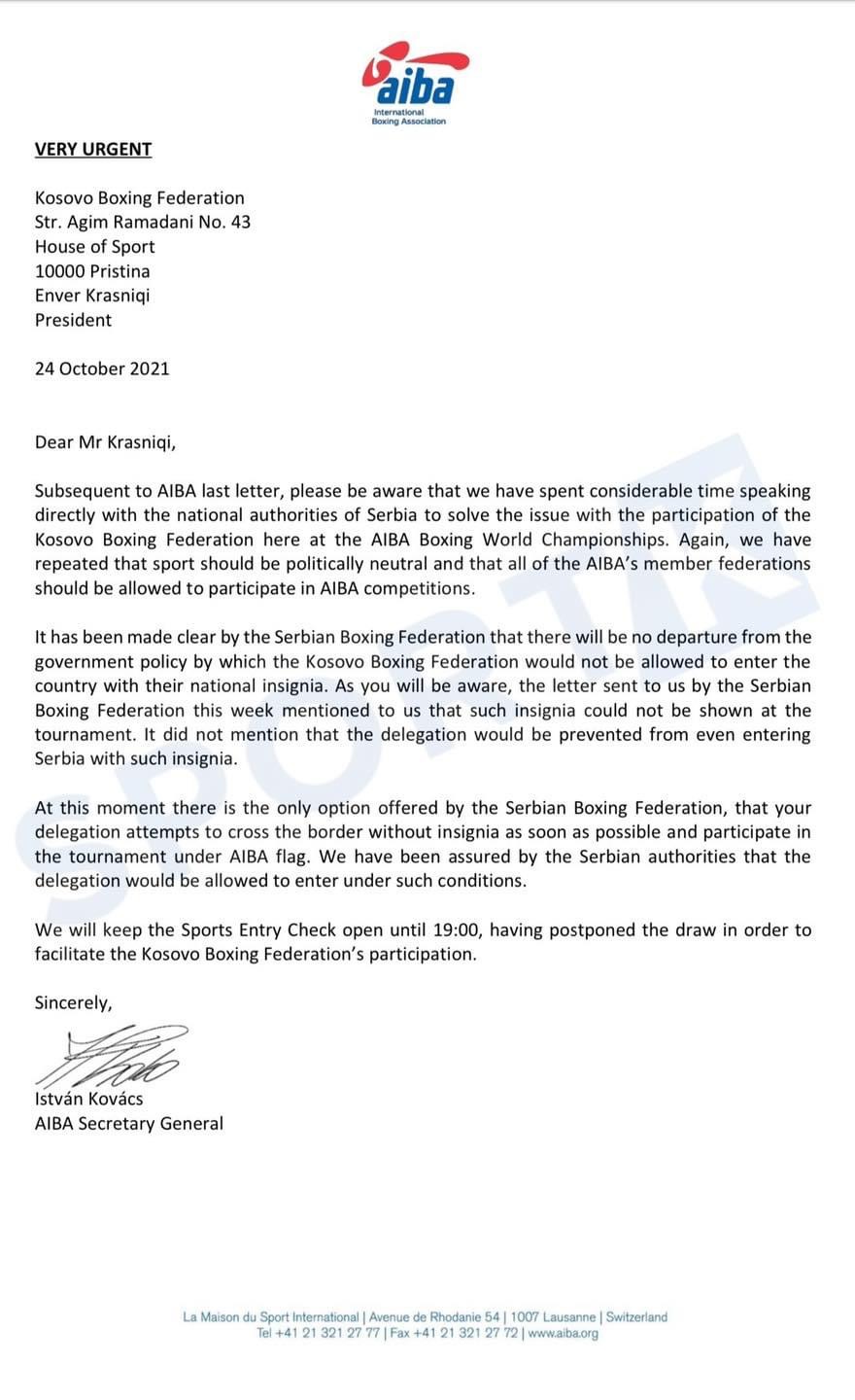 Në një letër urgjente nisur në adresë të FBoxK-së, AIBA ka rënë pre e presionit serb, duke kërkuar që Kosova të udhëtojë në botërorin e Beogradit, me kusht që t’i heqë simbolet dhe të prezantohet nën flamurin e AIBA-s.