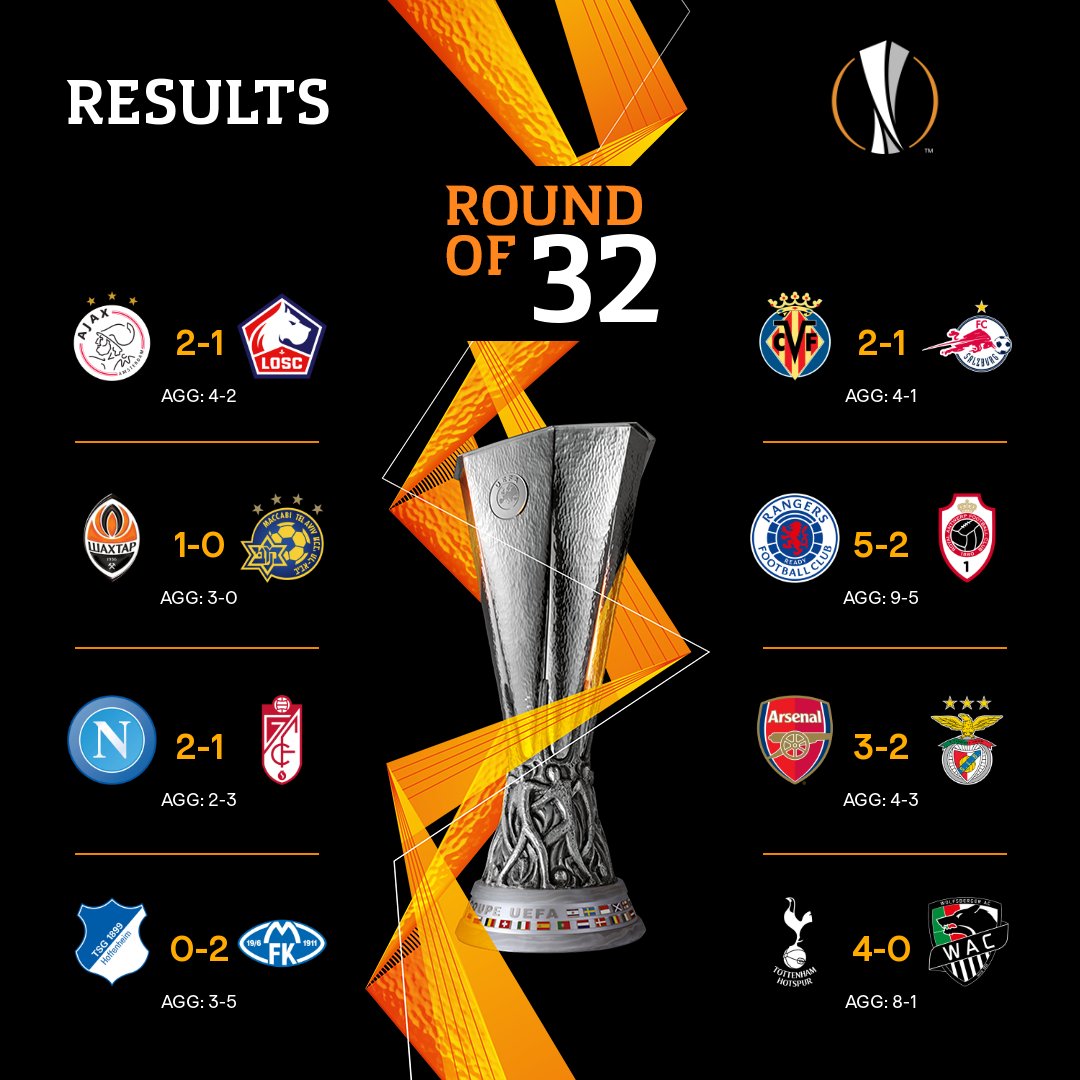 Tani kanë përfunduar të gjitha ndeshjet e 1/16 të Europa League. Ajaxi, Shakhtar Donetsk, Granada, Molde, Villarreal, Rangers dhe Arsenali do t’ju bashkangjiten Tottenham Hotspur në 16 më të mirat në kuadër të Europa League.